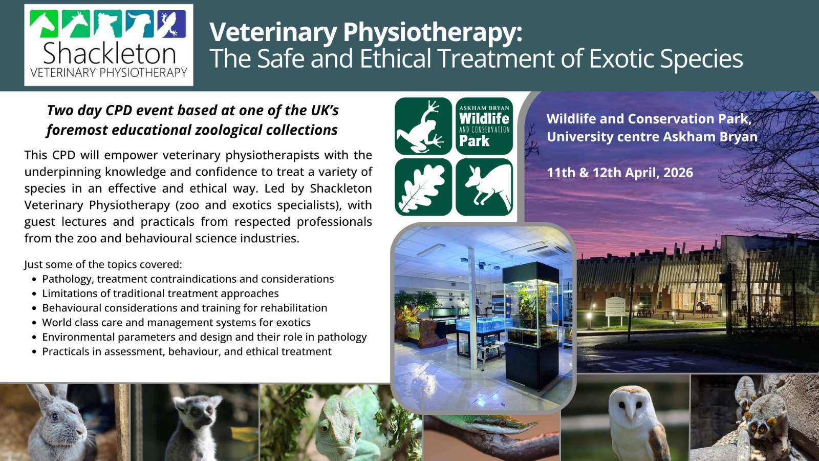 Specialist zoo and exotics physiotherapists, authors and CPD providers Shackleton Veterinary Physiotherapy (alongside a team of zoo industry specialists) are running an exciting new exotics treatment course for vet physios. Developed to meet and exceed CPD requirements for insurance regulations for exotics treatment, this course will provide vet physios with the knowledge and practical skills to treat exotic animals including rabbits, reptiles and commonly kept exotic mammals ethically and effectively.